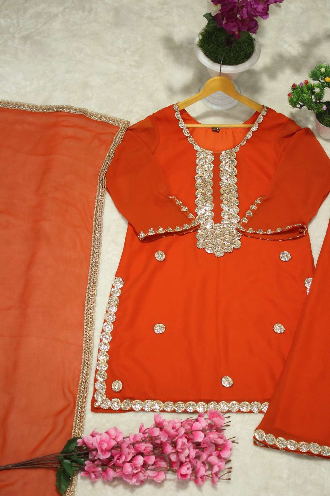 Embrace timeless beauty with this fully stitched set, crafted from soft georgette and adorned with foil embroidery and fancy piping. A perfect blend of comfort and sophistication for every special occasion.