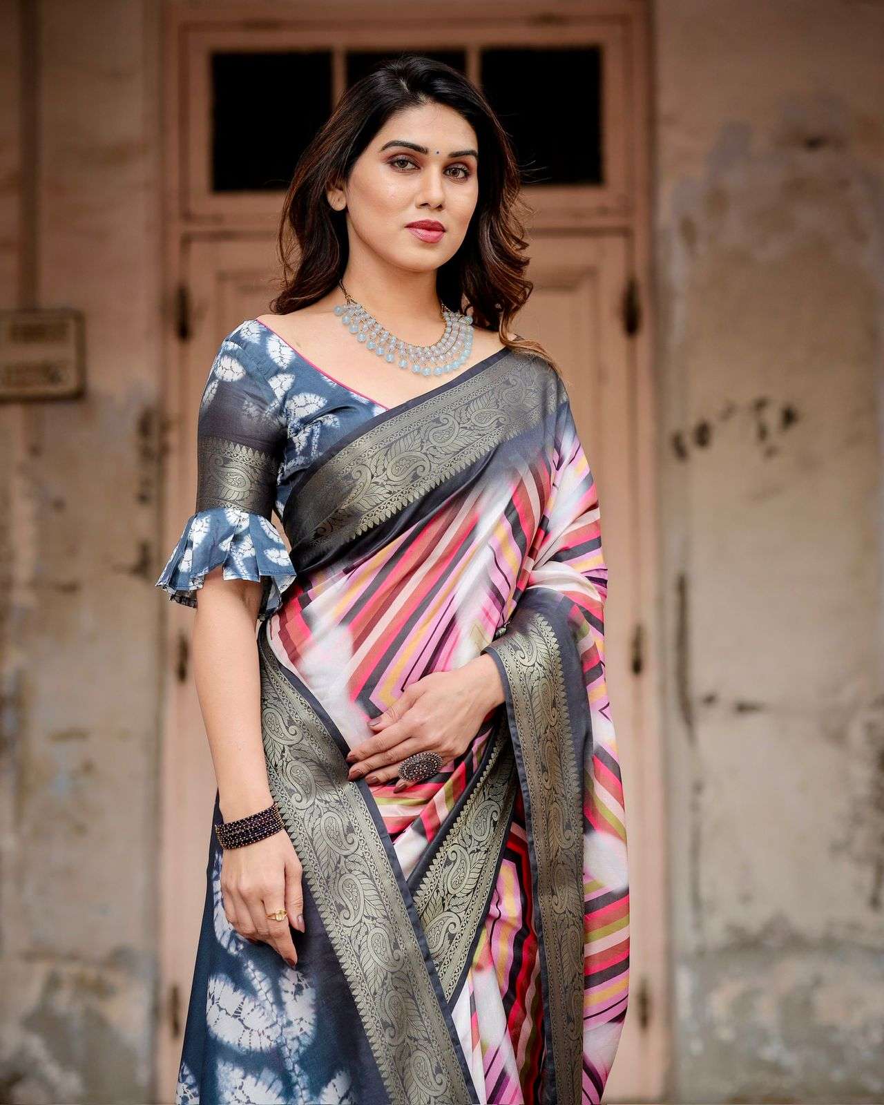 Color: Dark Charcoal Grey Base with Multi-Hued Stripes & Elegant Zari Border