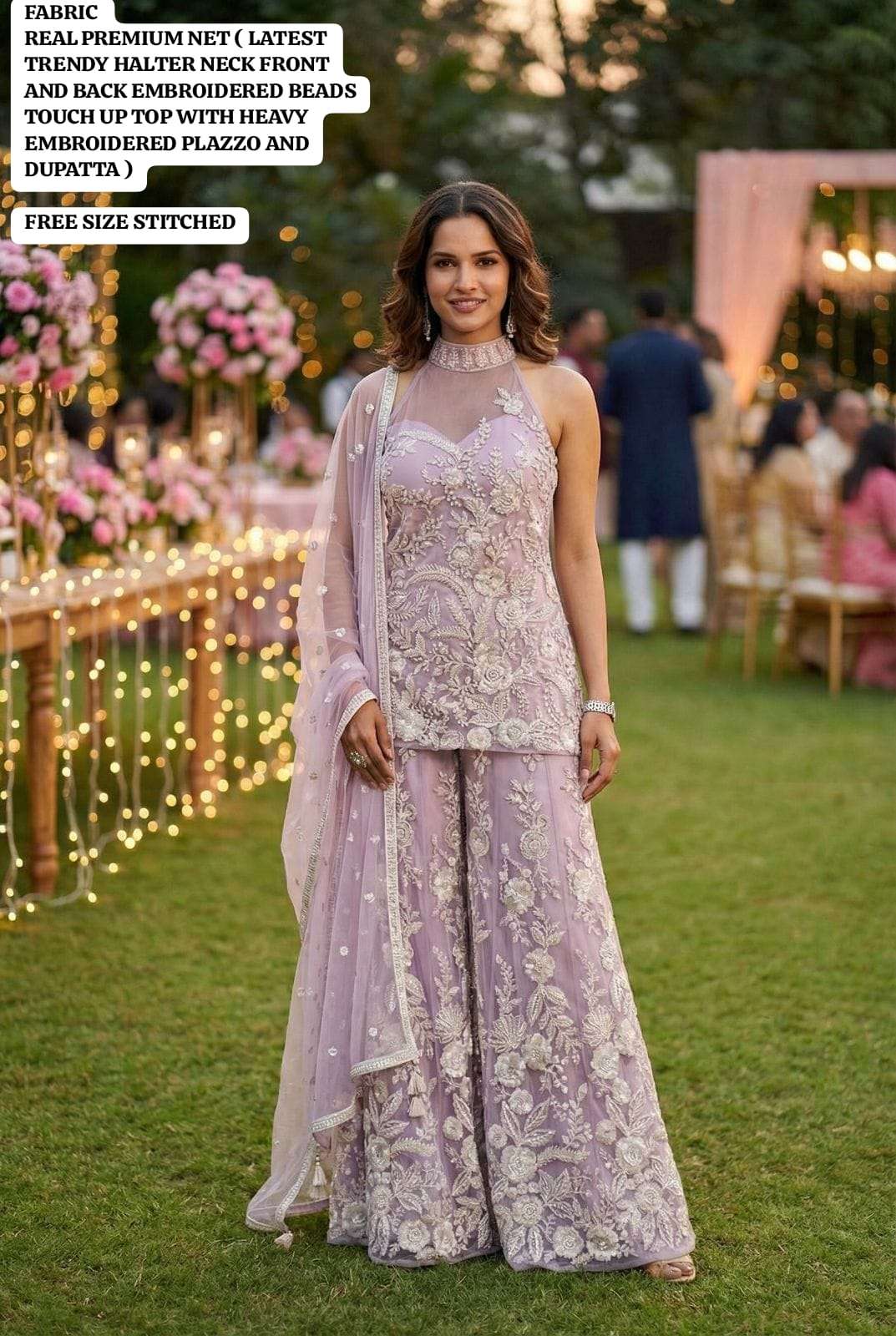 FABRIC - REAL PREMIUM NET ( LATEST TRENDY HALTER NECK FRONT AND BACK EMBROIDERED BEADS TOUCH UP TOP WITH HEAVY EMBROIDERED PLAZZO AND DUPATTA )