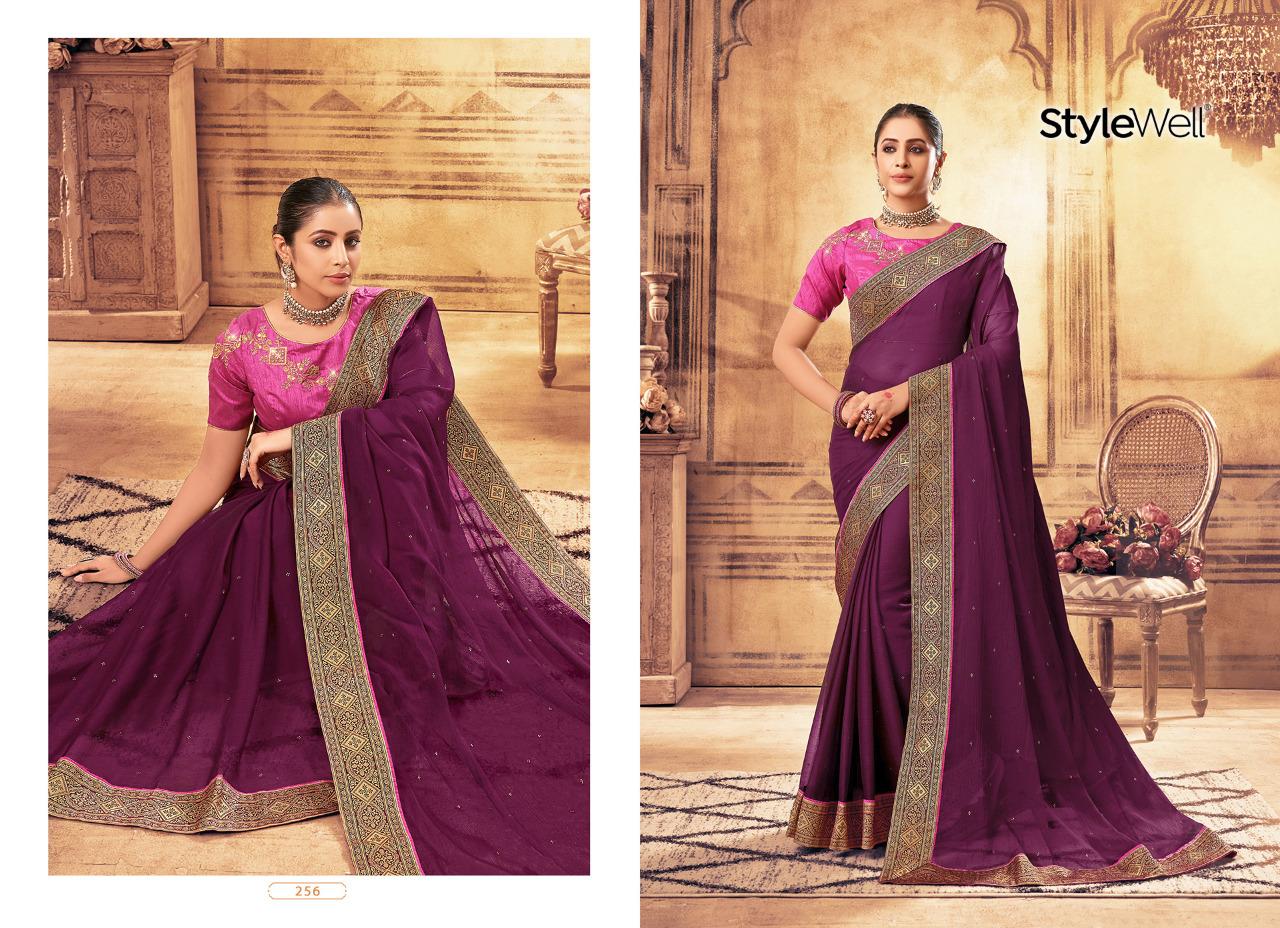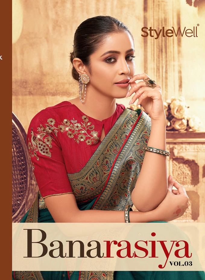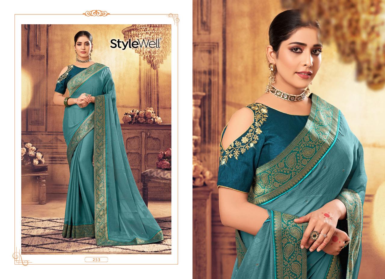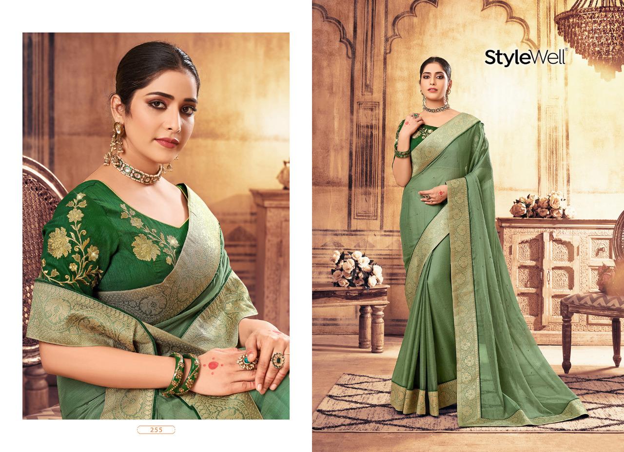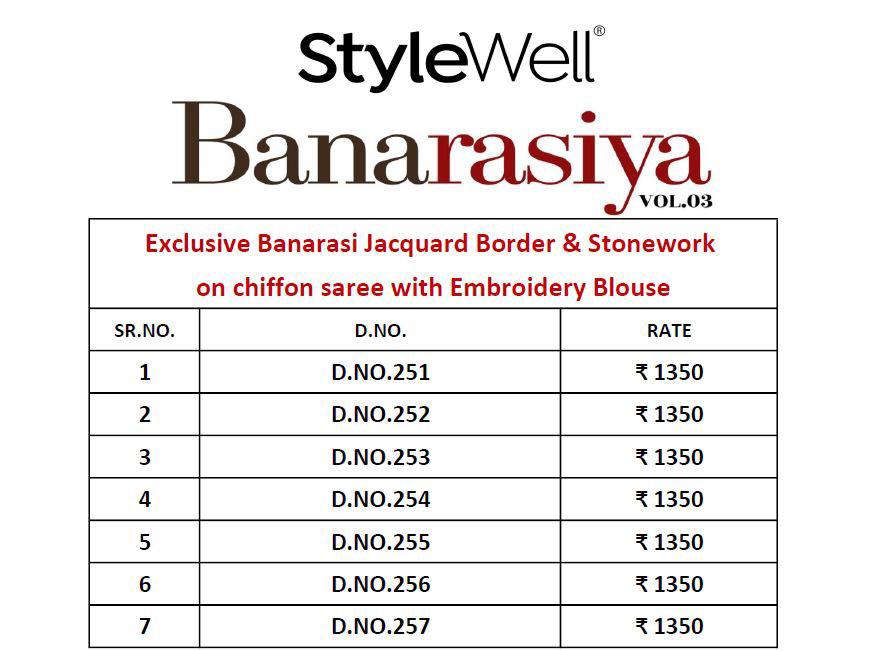 Stylewell Presents Banarasiya Vol-3 251 - 257 Series Moss Chiffon With Hand Diamond Work And Stitched Pure Banarasi Jacquard Border Fancy Party Wear Saree Collection
