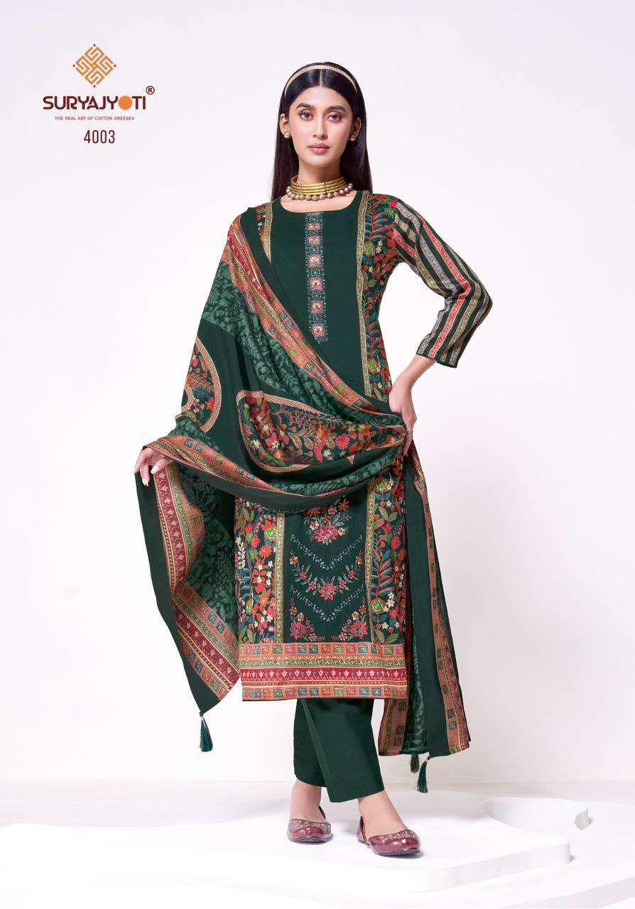 | Catalogue: | Suryajyoti KAAMINI VOL 4 Jaam Satin Discharge Print & Embroidery Work Suit |