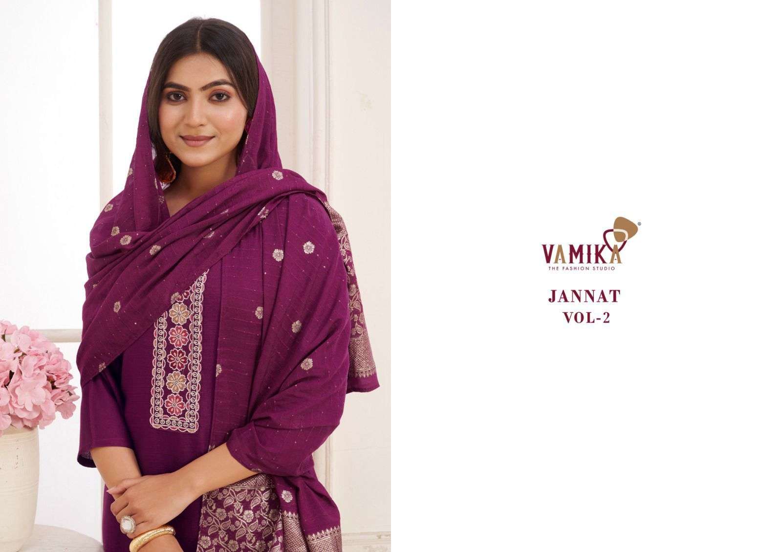 Catalogue: | Vamika Jannat Vol 02 Viscose Vertican Silk Suit with Hand Work |