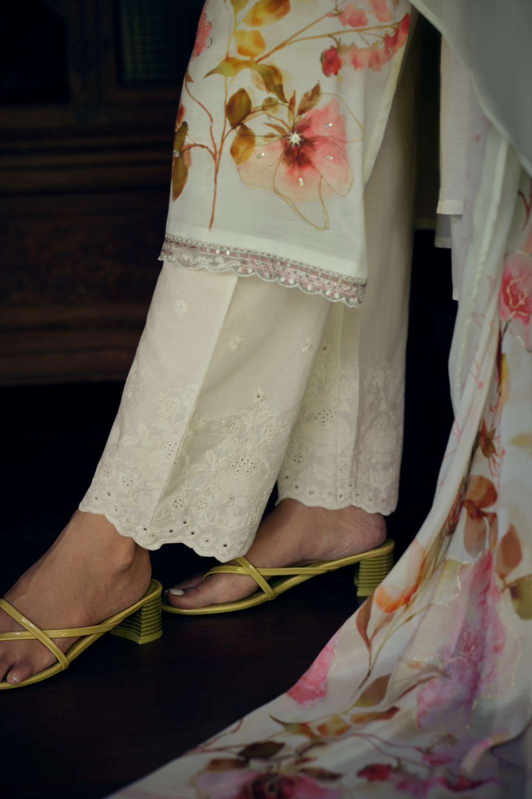 VISCOSE MUSLIN DIGITALLY PRINTED WITH EMBROIDERED NECKLINE AND BORDERS AND SOFT PITA HANDWORK DETAILING ON FLORAL PRINTS