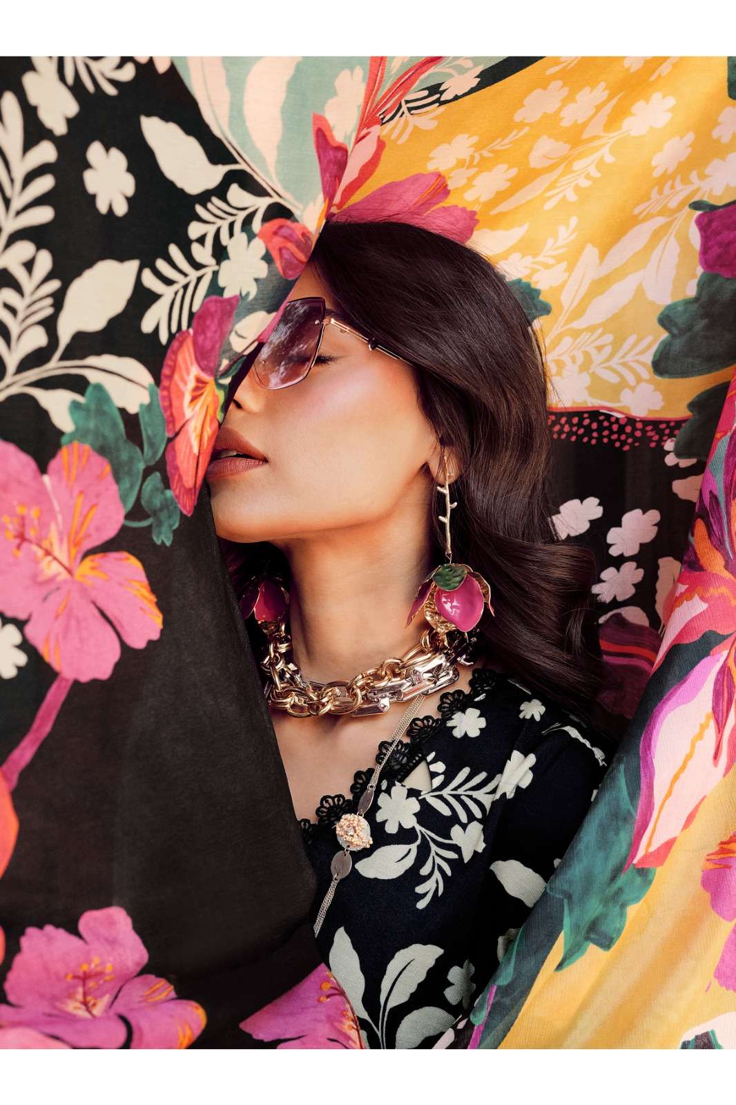VISCOSE MUSLIN DIGITALLY PRINTED WITH FLORAL LACES AND EMBROIDERED BORDERS