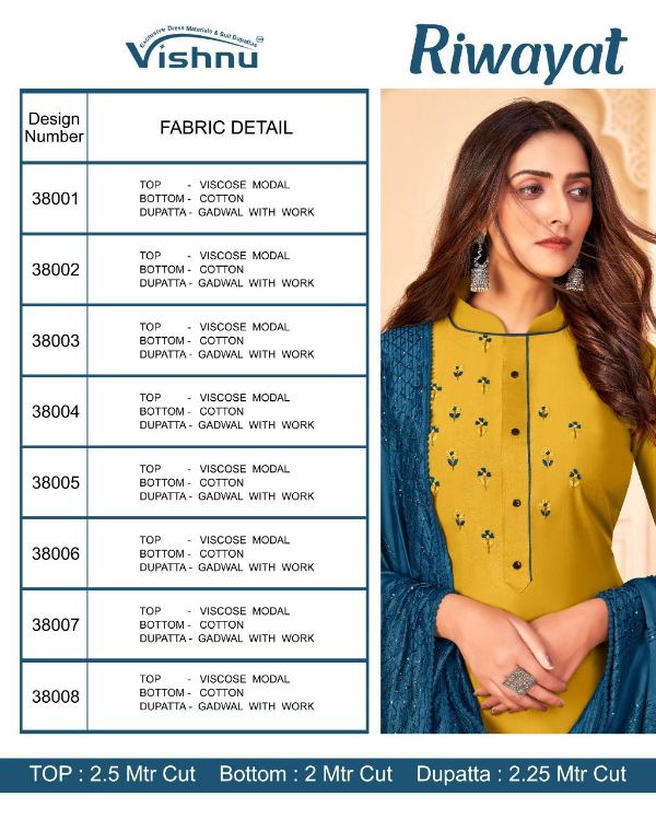 Vishnu Impex Presents Riwayat 38001 - 38008 Series Fancy Viscose Modal With Attractive Colours Fancy Salwar Kameez Collection