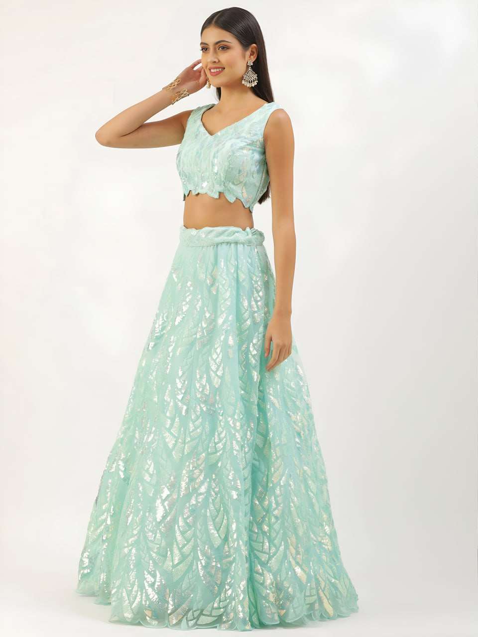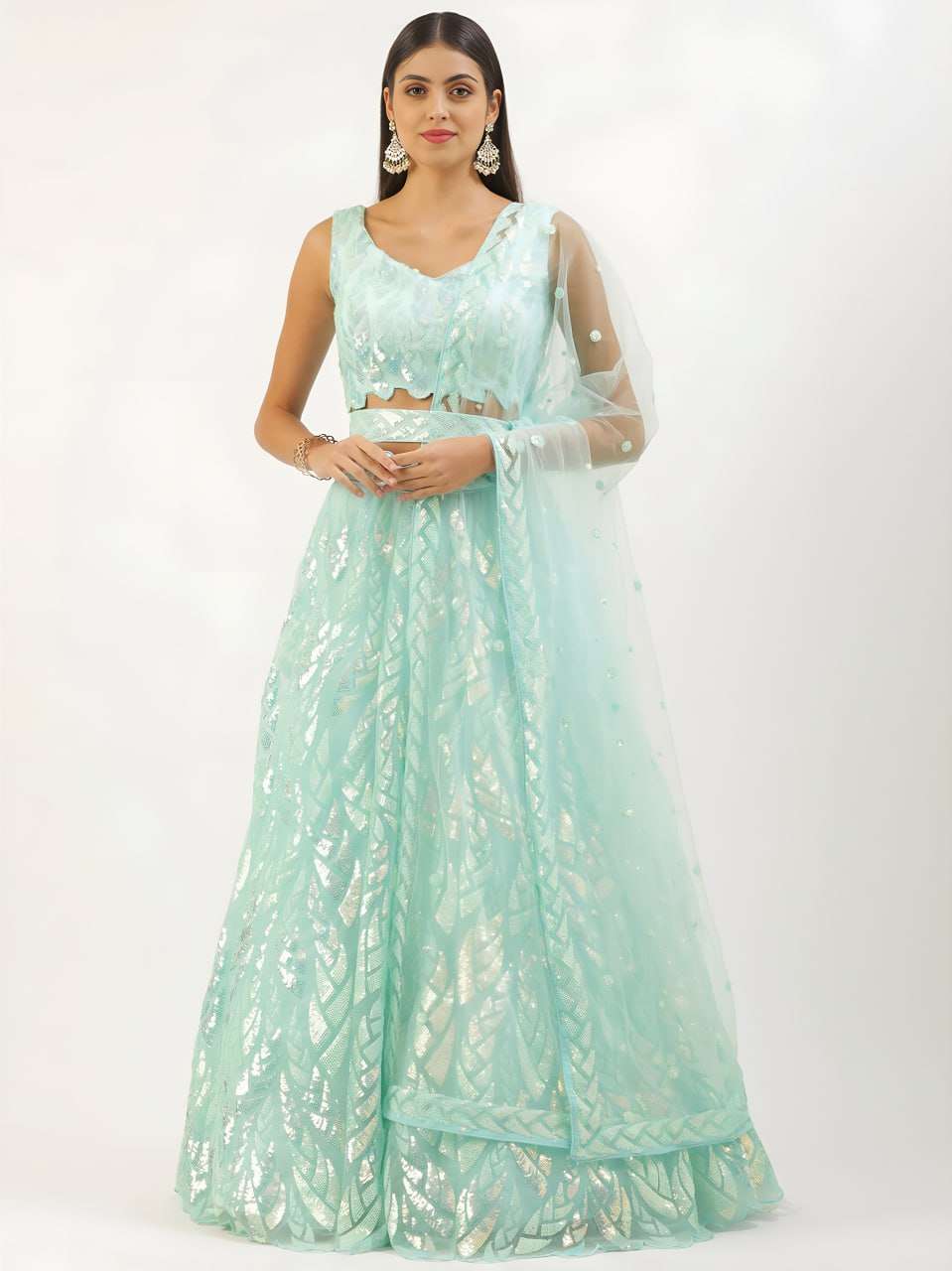 This light blue lehenga set shines with elegant sequins leaf embroidery layered over soft net fabric, creating a dreamy festive silhouette. Paired with a stylish embroidered blouse and lightweight dupatta, the ensemble is perfect for weddings, receptions, and grand celebrations, offering both comfort and luxury appeal.