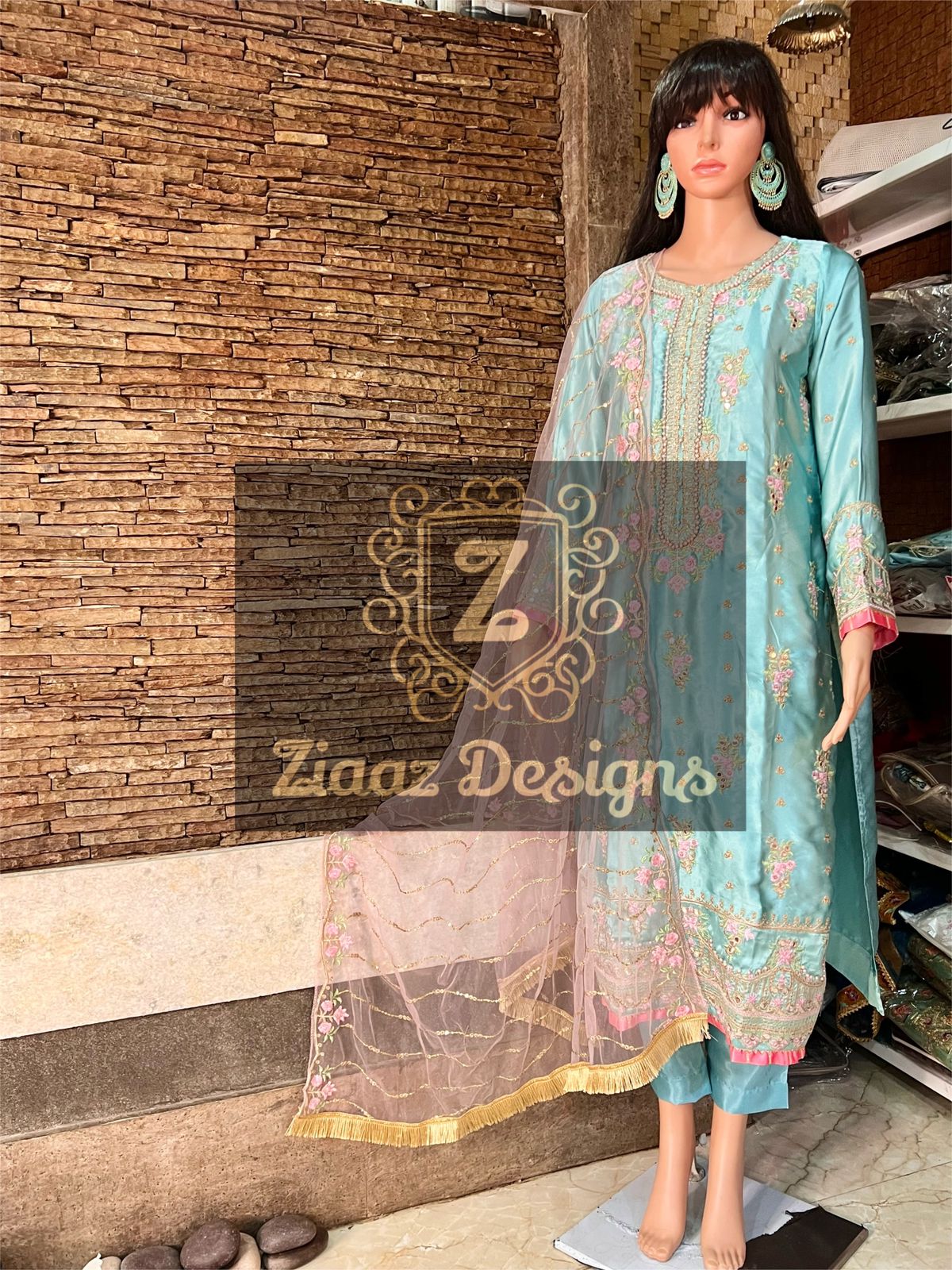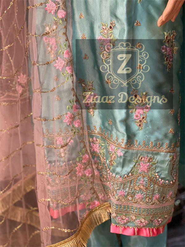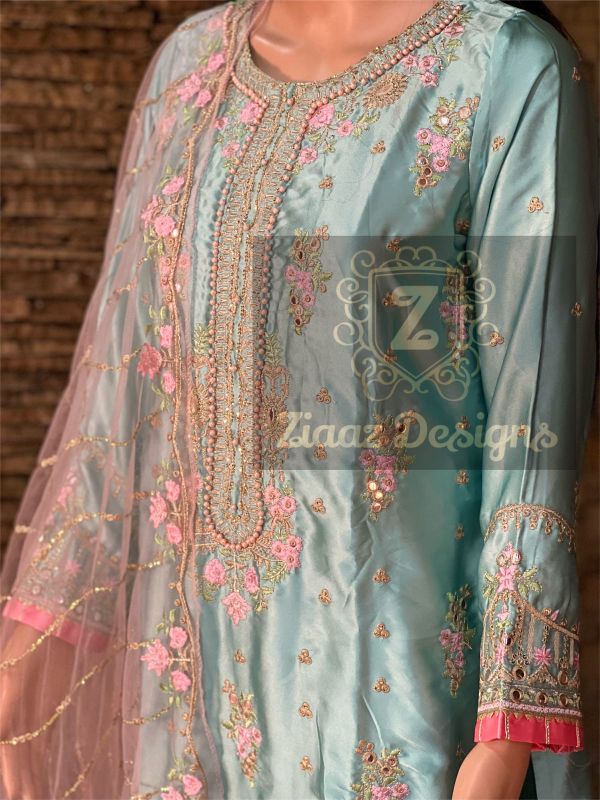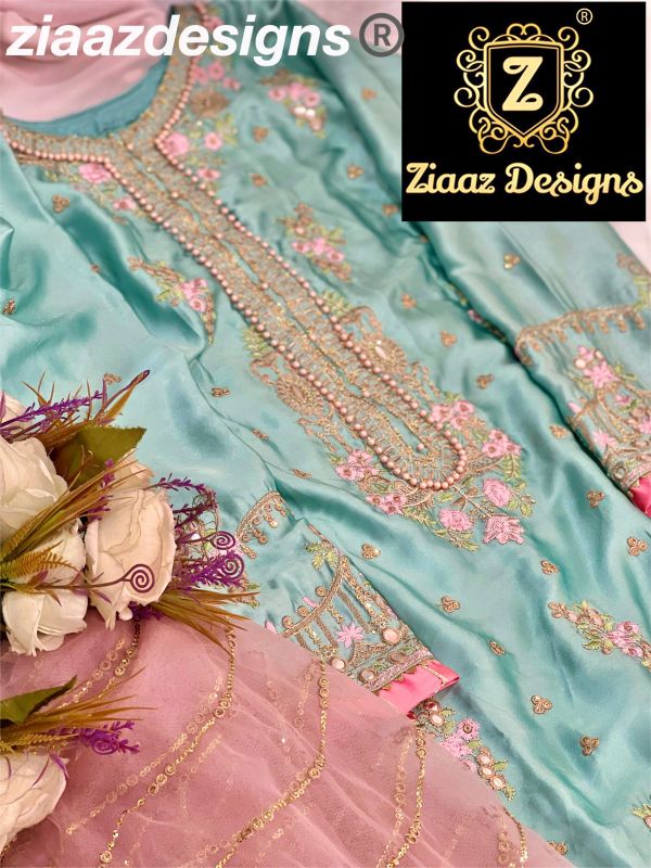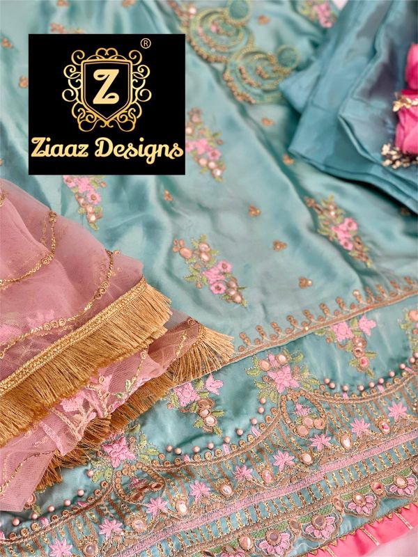 Ziaaz Designs Presents Noor Sky Satin Net Satin With Embroidery Work Pakistani Suits Collection